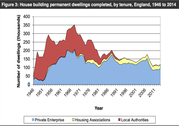 Now that does all sound rather good, but the Country is only building 137,490 properties a year (split down 114,250 built by private builders, 21,560 built by Housing Associations and and a paltry 1,680 council houses). If you look at the graph (courtesy of ONS), you will see nationally, the last time the country was building 230,000 houses a year was in the 1960’s.