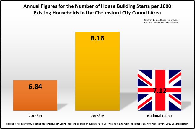 Looking closer to home, over the last 12 months, new building in the Chelmsford City Council area has grown. In 2014/15, for every one thousand existing households in the area, an additional 6.84 homes were built. For 2015/16, that figure is now 8.16 homes built per thousand existing households. Nationally, to meet that 1,000,000 new homes target, we need to be at 7.12 new homes per thousand, which means Chelmsford City Council is actually above the National target, the problem is the country is only building at a rate of 4.9 for every thousand exiting households – we can’t just rely on little old Chelmsford to build for the rest of the Country.
