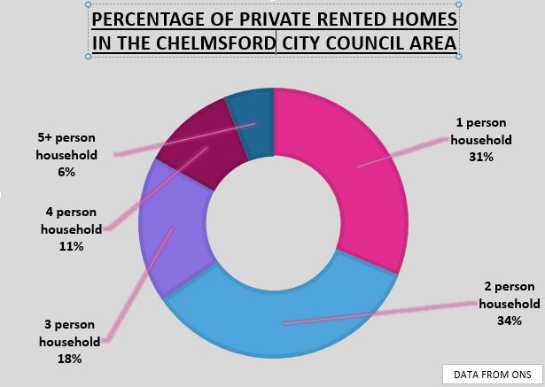 But it gets even more interesting when we focus on just private rental properties in Chelmsford, as it is the rental market in Chelmsford that really fascinates me. When I analysed those Chelmsford City Council private rental household composition figures, a slightly different picture appears. Of the 7,621 Private rental properties in the Chelmsford City Council area,