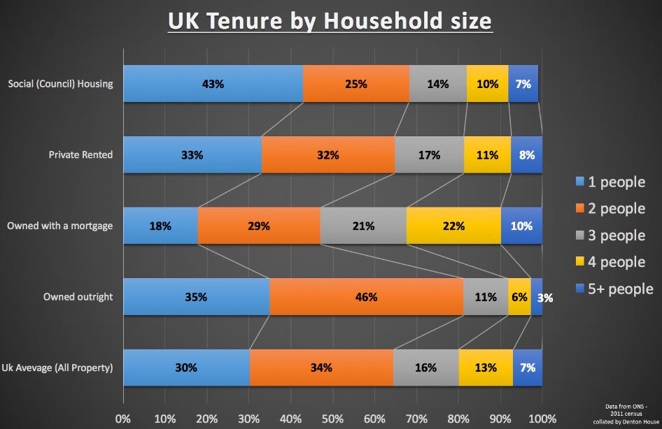 The vast majority of homeowners who don’t have a mortgage are occupied by one or two people (81% in fact), although this can be explained as residents being older, with some members of the family having moved out, or a pensioner living alone. People living on their own are more likely to live in a Council house (43%) and the largest households (those with 4 or more people living in them are homeowners with a mortgage – but again, that can be explained as homeowners with families tend to need a mortgage to buy. What surprised me was the even spread of private rented households and how that sector of population are so evenly spread across the occupant range – in fact that sector is the closest to the national average, even though they only represent a sixth of the population.