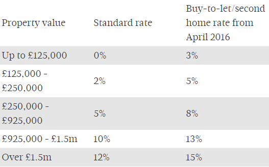 So, let us start by looking at what is going to be changing. The first change is stamp duty. Currently, you pay no stamp duty on the first £125,000. You then pay 2% between £125,000 – £250,000, 5% between £250,000 – £925,000, 10% above £925,000 up to £1.5m and then 12% above £1.5m. The proposed changes mean that as of April 2016, if a landlord buys a property for buy to let, their stamp duty bill will face a 3% surcharge.